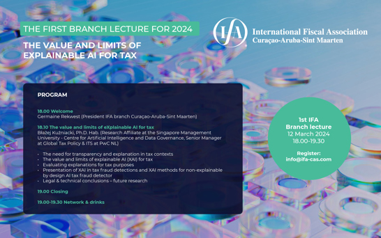 The topic of the lecture is "The value and limits of eXplainable AI for tax", by Dr. Blazej Kuzniacki, Research Affiliate at the Singapore Management University - Centre for Artificial Intelligence and Data Governance, Senior Manager at Global Tax Policy & ITS at PwC NL.