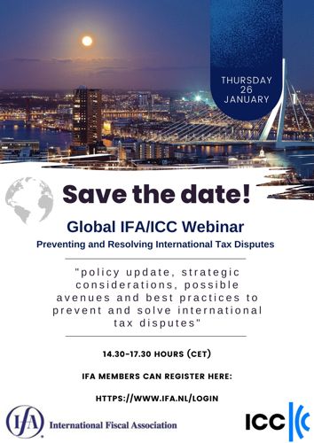 Together with the ICC, Global IFA is organising a Webinar on the Prevention and Resolution of International Tax Disputes to be held on 26 January 2023. In this webinar the topic which is at the heart of the global tax conversation will be addressed from a holistic perspective. Members of international organizations and leading international tax experts will be discussing the latest policy developments and, from a strategic and practical standpoint, will be exploring the possible avenues and best practices to prevent and resolve international tax disputes.
