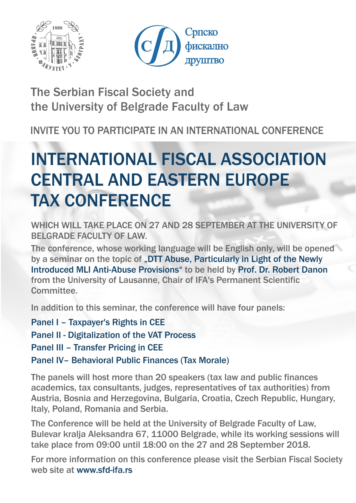 IFA Serbia and the Faculty of Law of the University of Belgrade are pleased to invite you to the IFA Central and Eastern European tax conference which will take place on 27 and 28 September in Belgrade.